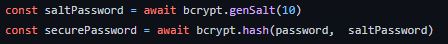 bcrypt.genSalt()를 통해 salt을 생성해준다. 인자로 10을 넘겨준 것을 라운드 수가 10이라는 것을 의미한다. 즉 2^10번 키 스트레칭을 수행할 것이다. 라운드 수가 높아질수록 연산 시간과 보안이 높아진다. 매번 실행 시마다 salt값이 바뀐다.