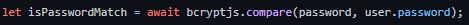 hash 값을 사용자가 입력한 비밀번호와 일치 여부를 확인하려면 bcrypt.compare()을 사용하면 된다. 이미지에서 bcryptjs라고 되어있는데 이는 Javascript로 작성된 bcrypt 라이브러리로 C++로 작성된 라이브러리보다 조금 더 많이 쓰인다.